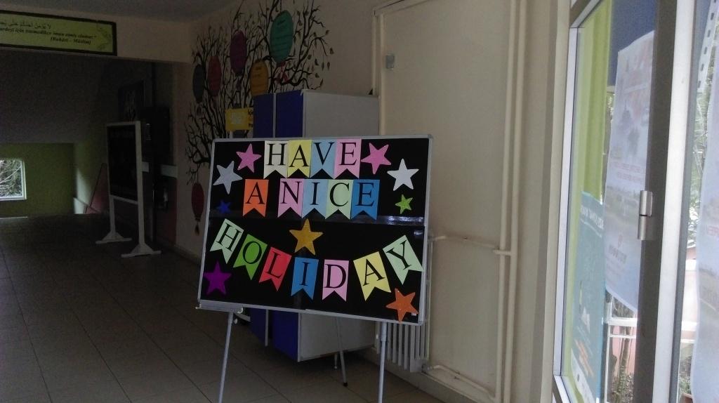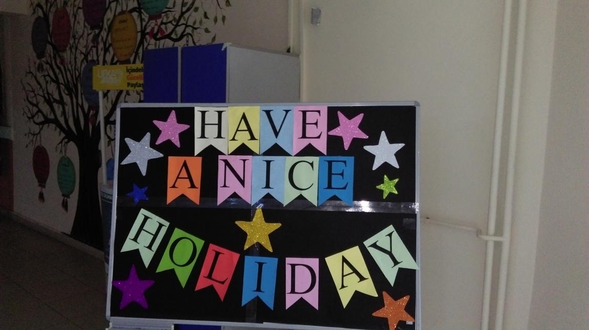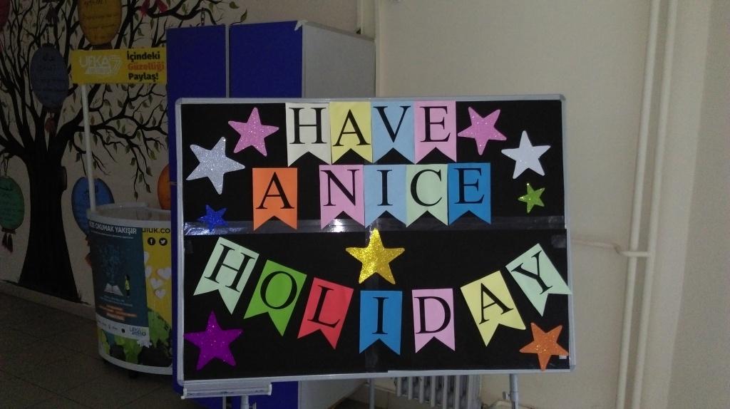 İngilizce öğretmenlerimiz İrem Huri BATMAZ ve Elveda DEMİR,Din Kültürü ve Ahlak Bilgis Öğretmenimiz Sümeyye ERDEM 15 Tatile çıkacak İngilizce proje sınıfımız 5/A için " Have a Nıce Holiday " (İyi Tatiller) panosu hazırladılar.Öğretmenlerimize bu güzel etkinlikleri için Teşekkür Ederiz.